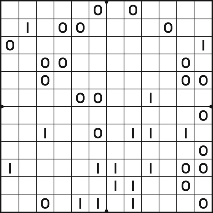 Every Sunday solve a special edition binairo. Remember: Solve each puzzle with only 0's and 1's and no more than two the same numbers may be placed directly next to or below each other. Every row and every column must contain as many zeroes as ones. The combination of zeroes and ones in every row must be unique, as does the combination in each column.