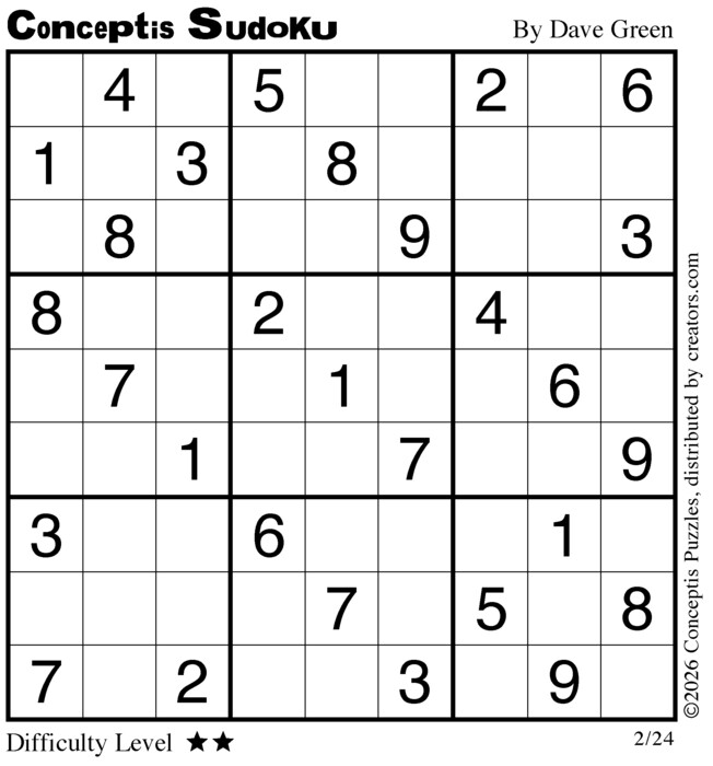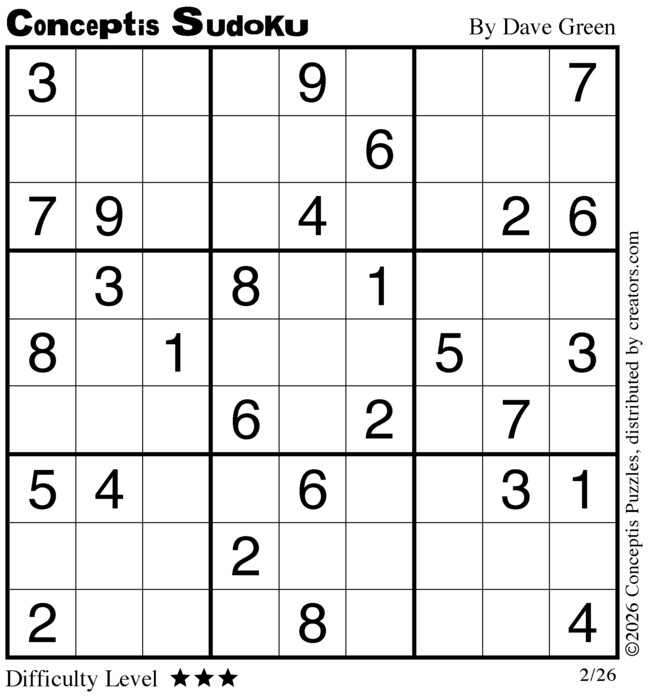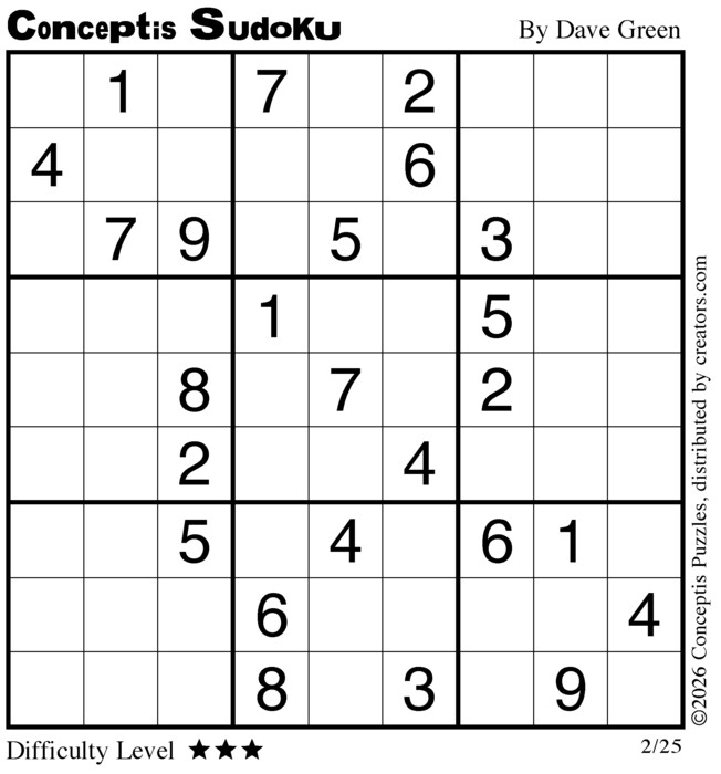 Each puzzle consists of a 9x9 grid containing given clues in various places. The object is to fill all empty squares so that the numbers 1 to 9 appear exactly once in each row, column and 3x3 box.