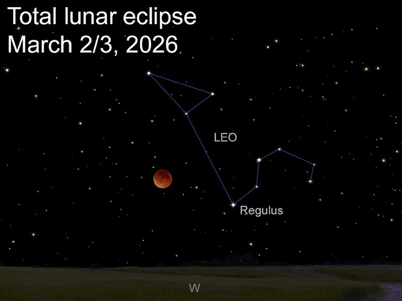 During the total phase, the moon will take on a dim coppery hue. This occurs because sunlight passing through our atmosphere is reddened and bent inward toward the darkened surface of the eclipsed moon, now suspended eerily against the stars of Leo, the lion.