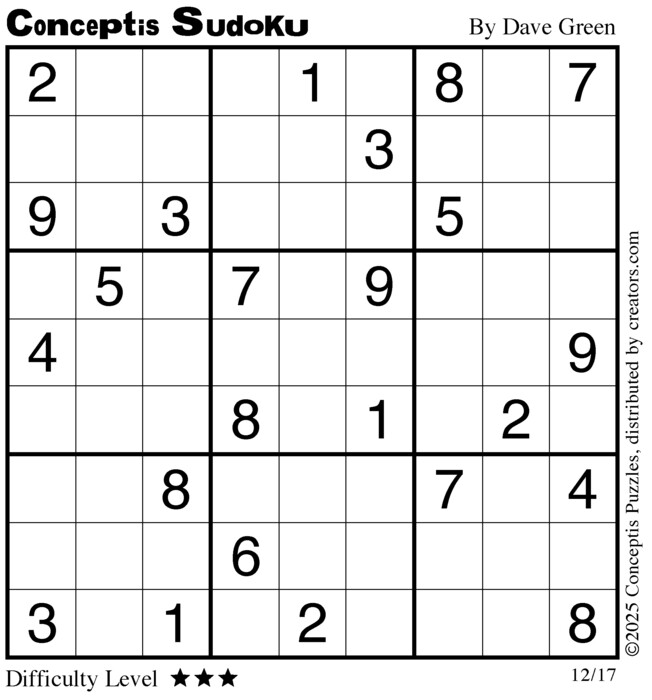 Each puzzle consists of a 9x9 grid containing given clues in various places. The object is to fill all empty squares so that the numbers 1 to 9 appear exactly once in each row, column and 3x3 box.